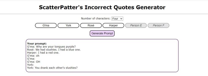 Swap names in prompt. Its just like an Incorrect quotes generator but it generates quotes instead of prompts. An incorrect quote is a popular internet trend where we put two fictional characters or sometimes real characters into a dialogue.